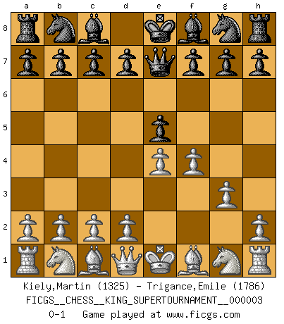 Last move : 0-1 2018 October 18 21:29:41 [Event "FICGS__CHESS__KING_SUPERTOURNAMENT__000003"] [Site "FICGS"] [Date "2018.09.16"] [Round "1"] [White "Kiely,Martin"] [Black "Trigance,Emile"] [Result "0-1"] [WhiteElo "1325"] [BlackElo "1786"] 1.e4 e5 2.f4 Qh4+ 3.g3 Qe7 0-1 This chess game has been lost on time (started : 2018.09.16 2:52:46) KGD : Keene's defense Player Black won this chess game. Follow this game move after move (download)The mistakes are there, waiting to be made. (Savielly Tartakower) Nicht daß Diemer aus Opportunismus Mitglied der NSDAP geworden wäre. Er war ein Fanatiker, in allem, was er tat. (Hans Ree) La mitad de las variaciones que son calculadas en una partida de torneo, resultan ser completamente superfluas. Desafortunadamente, nadie sabe por adelantado cual mitad. (Jan Tinman) Les échecs, c'est la lutte contre l'erreur. (Johannes Zukertort) Life is like a game of cards: the hand you are dealt represents determinism; the way you play it is free will. (Jawaharlal Nehru)