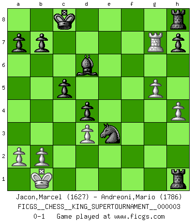 Last move : 0-1 2018 September 24 21:40:29 [Event "FICGS__CHESS__KING_SUPERTOURNAMENT__000003"] [Site "FICGS"] [Date "2018.09.16"] [Round "1"] [White "Jacon,Marcel"] [Black "Andreoni,Mario"] [Result "0-1"] [WhiteElo "1627"] [BlackElo "1786"] 1.e4 e5 2.f4 d5 3.fxe5 Qh4+ 4.g3 Qxe4+ 5.Qe2 Qxh1 6.Bg2 Qxg1+ 7.Qf1 Qxf1+ 8.Bxf1 c5 9.Bb5+ Bd7 10.Bxd7+ Nxd7 11.Nc3 d4 12.Nd5 O-O-O 13.d3 Nxe5 14.Bf4 Rxd5 15.O-O-O Bd6 16.Bxe5 Rxe5 17.h4 Re2 18.g4 Nf6 19.g5 Nd5 20.Rf1 Ne3 21.Rxf7 Rxc2+ 22.Kb1 Rh2 23.Rxg7 Rh1+ 0-1 KGD : Falkbeer counter-gambit Queenside Castling by player Black (move 12) Queenside Castling by player White (move 15) Player Black won this chess game. Follow this game move after move (download)When your house is on fire, you can't be bothered with the neighbors. Or, as we say in Chess, if your King is under attack you don't worry about losing a Pawn on the Queen's side. (Gary Kasparov) Wenn Dein Gegner dir ein Remis anbietet, versuch herauszufinden, weshalb er glaubt schlechter zu stehen. (Nigel Short) Tu eres para mi la Reina en d8 y yo soy el Peón en d7!!. (GM Eduard Gufeld) On a dit que l'homme se distingue de l'animal par le fait qu'il achète plus de livres qu'il ne peut en lire. Je voudrais suggérer qu'inclure à la liste des livres quelques livres d'échecs rendrait la distinction manifeste. (Edward Lasker) A government big enough to give you everything you want is strong enough to take everything you have. (Thomas Jefferson)