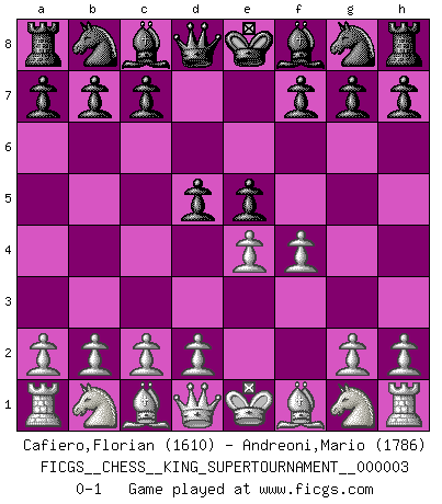 Last move : 0-1 2018 November 7 11:49:23 [Event "FICGS__CHESS__KING_SUPERTOURNAMENT__000003"] [Site "FICGS"] [Date "2018.09.16"] [Round "1"] [White "Cafiero,Florian"] [Black "Andreoni,Mario"] [Result "0-1"] [WhiteElo "1610"] [BlackElo "1786"] 1.e4 e5 2.f4 d5 0-1 KGD : Falkbeer counter-gambit Player Black won this chess game. Follow this game move after move (download)In Chess, as it is played by masters, chance is practically eliminated. (Emanuel Lasker) Privat ist Kortschnoi kein schlechter Mensch, sehr sympathisch. Aber während des Spiels ist er grausam. Er will dich töten. (Miguel Najdorf) El tablero es el mundo, las piezas es el fenomeno del universo, las reglas del juego son lo que llamamos leyes de la naturaleza y el jugador del lado opuesto, se encuentra oculto a nuestra vista. (Thomas Huxley) Echiquier : carré parfait, comme la Jérusalem nouvelle décrite par l'auteur de l'Apocalypse, huit cases sur huit, exaltation du chiffre 4, symbole du cosmos aux quatre horizons... où le noir et le blanc, l'ombre et la lumière, le mal et le bien s'entremêlent et se conjuguent. (Robert Couffignal, Le Gambit du poète) If things go wrong, don't go with them. (Roger Babson)