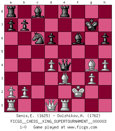 Last move : 1-0 2018 November 15 10:38:25 [Event "FICGS__CHESS__KING_SUPERTOURNAMENT__000003"] [Site "FICGS"] [Date "2018.09.16"] [Round "1"] [White "Senis,Enrico"] [Black "Dolzhikov,Aleksandr"] [Result "1-0"] [WhiteElo "1625"] [BlackElo "1762"] 1.e4 e5 2.f4 exf4 3.Nf3 d6 4.d4 g5 5.h4 g4 6.Ng5 h6 7.Nxf7 Kxf7 8.Bc4+ Kg7 9.Bxf4 Be7 10.g3 Nf6 11.Nc3 c5 12.Nd5 Nxd5 13.exd5 Bf6 14.c3 Re8+ 15.Be2 cxd4 16.cxd4 Qa5+ 17.Kf2 Qxd5 18.Be3 Nc6 19.Bxg4 Qe4 20.Re1 1-0 This chess game has been lost on time (started : 2018.09.16 2:52:46) KGA : Fischer defense Player White won this chess game. Follow this game move after move (download)Up to this point White has been following well-known analysis. But now he makes a fatal error: he begins to use his own head. (Siegbert Tarrasch) Bis jetzt ist Weiß einer wohlbekannten Analyse gefolgt. Aber jetzt begeht er einen schrecklichen Fehler: Er beginnt seinen eigenen Kopf zu benutzen. (Siegbert Tarrasch) Tu eres para mi la Reina en d8 y yo soy el Peón en d7!!. (GM Eduard Gufeld) On n'a jamais que l'âge auquel on a commence à jouer aux échecs car après on cesse de vieillir. (Capablanca) Perseverance does not equal worthiness. Next time you want to get my attention, wear something fun. Low-riding jeans are hot. (Gregory House, House M.D.)
