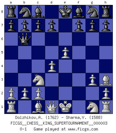 Last move : 0-1 2018 November 17 11:0:3 [Event "FICGS__CHESS__KING_SUPERTOURNAMENT__000003"] [Site "FICGS"] [Date "2018.09.16"] [Round "1"] [White "Dolzhikov,Aleksandr"] [Black "Sharma,Vivek"] [Result "0-1"] [WhiteElo "1762"] [BlackElo "1588"] 1.e4 e5 2.f4 Qh4+ 3.g3 Qf6 4.fxe5 Qxe5 5.Nc3 Nf6 6.d4 Qe6 7.Bh3 Qb6 8.e5 Ng8 0-1 This chess game has been lost on time (started : 2018.09.16 2:52:46) King's gambit Player Black won this chess game. Follow this game move after move (download)No Chess Grandmaster is normal; they only differ in the extent of their madness. (Viktor Korchnoi) Bis zum Jahr 1971 verlief in meiner Schachkariere alles glatt. Dieses dramatische Match [Fischer-Taimanov 6:0] machte mein Leben zur Hölle. (Mark Taimanov) El jugador blanco perdió porque fallo en recordar la coreccta continuación y tuvo que pensar por sí mismo las movidas. (Siegbert Tarrasch) Le jeu d'échecs fait naître et fortifie en nous plusieurs qualités précieuses dans le cours de l'existence, telles que la prévoyance, la circonspection, la prudence, et la persévérance. (Benjamin Franklin - 1783, la morale des échecs) If everyone is thinking alike, then somebody isn't thinking. (US General George S. Patton)