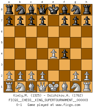 Last move : 0-1 2018 October 16 20:58:30 [Event "FICGS__CHESS__KING_SUPERTOURNAMENT__000003"] [Site "FICGS"] [Date "2018.09.16"] [Round "1"] [White "Kiely,Martin"] [Black "Dolzhikov,Aleksandr"] [Result "0-1"] [WhiteElo "1325"] [BlackElo "1762"] 1.e4 e5 2.f4 exf4 0-1 This chess game has been lost on time (started : 2018.09.16 2:52:46) King's gambit accepted Player Black won this chess game. Follow this game move after move (download)The tactician must know what to do whenever something needs doing; the strategist must know what to do when nothing needs doing. (Savielly Tartakover) Alles was am Schachbrett zählt sind gute Züge. (Robert James Fischer) La partida mas dura de ganar es una partida ganada. (Emanuel Lasker) Les erreurs sont comme les malheurs, elles n'arrivent jamais seules. (Siegbert Tarrasch) If computers get too powerful, we can organize them into committees. That'll do them in. (Anonymous)