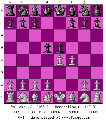 Last move : 0-1 2018 September 16 14:2:43 [Event "FICGS__CHESS__KING_SUPERTOURNAMENT__000003"] [Site "FICGS"] [Date "2018.09.16"] [Round "1"] [White "Poliakov,Youri"] [Black "Horoshilov,Andrey"] [Result "0-1"] [WhiteElo "1664"] [BlackElo "1713"] 1.e4 e5 2.f4 d5 0-1 KGD : Falkbeer counter-gambit Player Black won this chess game. Follow this game move after move (download)Chess mastery essentially consists of analyzing Chess positions accurately. (Mikhail Botvinnik) Ich bin der einzige Schachspieler, der sich während der Vorbereitungen zum Turnier verletzt hat. (Woody Allen) Debemos de asegurarnos de que el Ajedrez no se convierta en un lenguaje muerto, muy interesante, pero solo para un grupo muy pequeño. (Sytze Faber) La guerre est enfant de la passion, la passion est enfant du narcissisme et le narcissisme est l'enfant. (...) Une autre partie ? (Thibault de Vassal) It's not enough to succeed. Others must fail. (Gore Vidal)