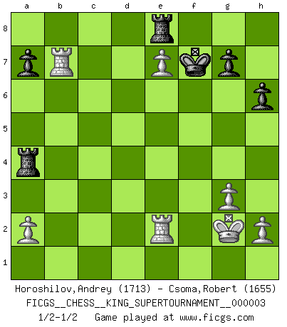 Last move : 1/2-1/2 2018 December 16 22:51:45 [Event "FICGS__CHESS__KING_SUPERTOURNAMENT__000003"] [Site "FICGS"] [Date "2018.09.16"] [Round "1"] [White "Horoshilov,Andrey"] [Black "Csoma,Robert"] [Result "1/2-1/2"] [WhiteElo "1713"] [BlackElo "1655"] 1.e4 e5 2.f4 exf4 3.Nf3 d6 4.d4 Nf6 5.Nc3 Be7 6.Bxf4 O-O 7.e5 dxe5 8.Bxe5 Nbd7 9.Be2 c6 10.Qd3 Nxe5 11.Nxe5 Be6 12.O-O Qd6 13.Ne4 Nxe4 14.Qxe4 f5 15.Qd3 Rad8 16.c3 Bf6 17.Nf3 c5 18.Rfd1 c4 19.Qc2 Rde8 20.Rab1 Bd5 21.b3 b5 22.bxc4 Bxc4 23.Bxc4+ bxc4 24.Qxf5 Qa3 25.Qd5+ Kh8 26.Qxc4 Rc8 27.Qb3 Rxc3 28.Qxa3 Rxa3 29.Rd2 h6 30.Ne5 Bxe5 31.dxe5 Re8 32.Re2 Ra5 33.e6 Ra6 34.e7 Kg8 35.Rb7 Kf7 36.g3 Ra5 37.Kf2 Ra4 38.Kf3 Ra3+ 39.Kg2 Ra5 40.Rf2+ Kg8 41.Rd2 Kf7 42.Re2 Ra4 43.Rf2+ Kg8 44.Re2 Kf7 45.Rf2+ Kg8 46.Re2 Kf7 1/2-1/2 KGA : Fischer defense Kingside Castling by player Black (move 6) Kingside Castling by player White (move 12) This chess game ended in a draw. Follow this game move after move (download)Fischer prefers to enter Chess history alone. (Miguel Najdorf) Ohne Fehler kann es keine Brillanz geben. (Emanuel Lasker) Jugadores de primera clase pierden en contra de jugadores de segunda clase porque los jugadores de segunda clase a veces juegan una partida de primer clase. (Siegbert Tarrasch) Avant la finale, les dieux ont créé le milieu de partie. (Tarrasch) Knowledge rests not upon truth alone, but upon error also. (Carl G. Jung)
