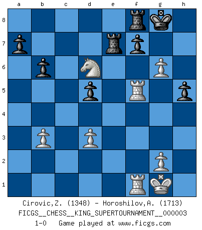 Last move : 1-0 2018 October 22 15:11:24 [Event "FICGS__CHESS__KING_SUPERTOURNAMENT__000003"] [Site "FICGS"] [Date "2018.09.16"] [Round "1"] [White "Cirovic,Zeljko"] [Black "Horoshilov,Andrey"] [Result "1-0"] [WhiteElo "1348"] [BlackElo "1713"] 1.e4 e5 2.f4 d5 3.exd5 Qxd5 4.fxe5 Qxe5+ 5.Qe2 Qxe2+ 6.Bxe2 Nf6 7.Nf3 Bd6 8.Nc3 O-O 9.O-O Bf5 10.Nb5 Bxc2 11.Nxd6 cxd6 12.b3 Bg6 13.Bb2 Nbd7 14.Bxf6 Nxf6 15.Nh4 Be4 16.Bf3 Rfe8 17.Bxe4 Nxe4 18.d3 Nd2 19.Rf2 g5 20.Nf5 Nxb3 21.axb3 d5 22.Nd6 Re7 23.Rf5 h6 24.Raf1 Rf8 25.h4 b6 26.hxg5 h5 27.g6 1-0 KGD : Falkbeer counter-gambit Kingside Castling by player Black (move 8) Kingside Castling by player White (move 9) Player White won this chess game. Follow this game move after move (download)When you don't know what to play, wait for an idea to come into your opponent's mind. You may be sure that idea will be wrong. (Siegbert Tarrasch) Du kannst im Schach nur gut werden, wenn du das Spiel liebst. (Robert James Fischer) Yo considero que Fischer es uno de los expertos mas grandes de aperturas de siempre. (Keith Hayward) À la honte des hommes, on sait que les lois du jeu sont les seules qui soient partout justes, claires, inviolables et exécutées. Pourquoi l'Indien qui a donné les règles du jeu d'échecs est-il obéi de bon gré dans toute la terre, et que les décrétales des papes, par exemple, sont aujourd'hui un objet d'horreur et de mépris ? C'est que l'inventeur des échecs combina tout avec justesse pour la satisfaction des joueurs, et que les papes, dans leurs décrétales, n'eurent en vue que leur seul avantage. L'Indien voulut exercer également l'esprit des hommes et leur donner du plaisir; les papes ont voulu abrutir l'esprit des hommes. Voltaire (Dictionnaire philosophique / Garnier 1967) The age of a woman doesn't mean a thing. The best tunes are played on the oldest fiddles. (Ralph Waldo Emerson)