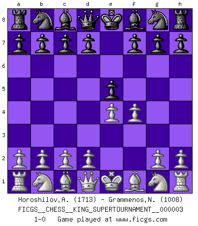 Last move : 1-0 2018 October 16 8:55:46 [Event "FICGS__CHESS__KING_SUPERTOURNAMENT__000003"] [Site "FICGS"] [Date "2018.09.16"] [Round "1"] [White "Horoshilov,Andrey"] [Black "Grammenos,Nikos"] [Result "1-0"] [WhiteElo "1713"] [BlackElo "1008"] 1.e4 e5 2.f4 1-0 This chess game has been lost on time (started : 2018.09.16 2:52:46) King's gambit Player White won this chess game. Follow this game move after move (download)He who takes the Queen's Knight's Pawn will sleep in the streets. (Anonymous) Die Neutralität betrachte ich als eine schwere Krankheit. (Viktor Kortschnoi) El arma más poderosa en el Ajedrez, es tener la próxima movida. (David Bronstein) Si le désir cupide (et stupide) de gagner est une inépuisable source de souffrance, une combinaison brillante sur l'échiquier est une découverte : le coquelicot qui s'épanouit lorsque apparaît la Voie Lactée. (Arrabal) Hold em is to stud what chess is to checkers. (Johnny Moss)
