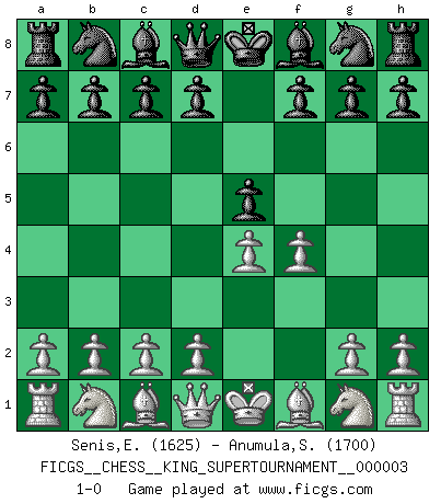 Last move : 1-0 2018 October 16 8:55:46 [Event "FICGS__CHESS__KING_SUPERTOURNAMENT__000003"] [Site "FICGS"] [Date "2018.09.16"] [Round "1"] [White "Senis,Enrico"] [Black "Anumula,Siddhartha Vijay Raj"] [Result "1-0"] [WhiteElo "1625"] [BlackElo "1700"] 1.e4 e5 2.f4 1-0 This chess game has been lost on time (started : 2018.09.16 2:52:46) King's gambit Player White won this chess game. Follow this game move after move (download)By the beauty of his games, the clarity of his play, and the brilliance of his ideas, Fischer made himself an artist of the same stature as Brahms, Rembrandt, and Shakespeare. (David Levy) Der vorletzte Fehler gewinnt. (Savielly Grigorievitsch Tartakower) El Ajedrez es el juego mas altamente simbólico, pero las agresiones estan por lo tanto aún mas francamente representadas en la partida. Tal vez comenzo como un juego de guerra; Algo como la representación de una batalla en miniatura entre las fuerzas de dos reinos. (Karl Meninger) Le joueur d'Echecs qui veut atteindre le top est obligé de développer son propre credo créatif. Alexeï Stepanovicth Souétine. Il est facile d'écrire des livres ! Ce qui est difficile, c'est de jouer ! (Alexeï Stepanovicth Souétine) Whatever you do, don't be bored. This is absolutely the most exciting time we could have possibly hoped to be alive. And things are just starting. (From movie Waking life)