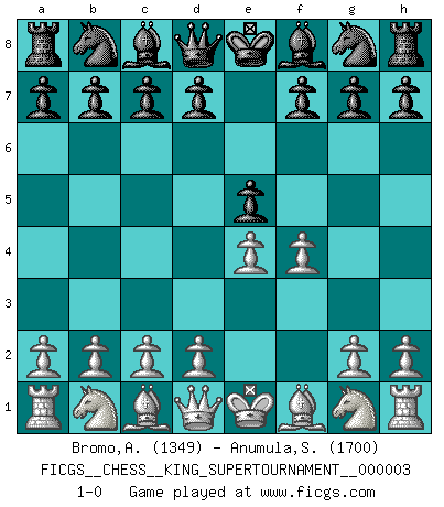 Last move : 1-0 2018 October 16 8:55:46 [Event "FICGS__CHESS__KING_SUPERTOURNAMENT__000003"] [Site "FICGS"] [Date "2018.09.16"] [Round "1"] [White "Bromo,Alexis"] [Black "Anumula,Siddhartha Vijay Raj"] [Result "1-0"] [WhiteElo "1349"] [BlackElo "1700"] 1.e4 e5 2.f4 1-0 This chess game has been lost on time (started : 2018.09.16 2:52:46) King's gambit Player White won this chess game. Follow this game move after move (download)Best by test: 1. e4 (Bobby Fischer) Im Hotelzimmer gab es nur zwei Schaben. (Über die Turnierbedingungen) (Peter Swidler) Cuando la partida de Ajedrez termina, el Peón y el Rey regresan a la misma caja. (Irish saying) Il a essayé de se convaincre qu'il pourrait empêcher toutes les erreurs et ne jamais perdre. L'horreur ! Gary Kasparov au sujet de Robert Fischer. The only thing that matters is the evidence. (Horatio Caine, C.S.I. Miami)