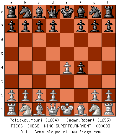 Last move : 0-1 2018 September 17 0:54:15 [Event "FICGS__CHESS__KING_SUPERTOURNAMENT__000003"] [Site "FICGS"] [Date "2018.09.16"] [Round "1"] [White "Poliakov,Youri"] [Black "Csoma,Robert"] [Result "0-1"] [WhiteElo "1664"] [BlackElo "1655"] 1.e4 e5 2.f4 exf4 0-1 King's gambit accepted Player Black won this chess game. Follow this game move after move (download)It is the aim of the modern school, not to treat every position according to one general law, but according to the principle inherent in the position. (Richard Reti) Alles was ich jemals tun will ist Schach spielen. (Robert James Fischer) Te sientas frente a un tablero y repentinamente tu corazón brinca. Tu mano tiembla al tomar una pieza y moverla. Pero lo que el Ajedrez te enseña es que tu debes permanecer ahí con calma y pensar de que si realmente es una buena idea o de que si hay otras ideas mejores. (Stanley Kubrick) L'ordinateur a tué l'originalité. Il n'y a plus guère d'aventures sur l'échiquier. (Jacob Murray) Better than a thousand days of diligent study is one day with a great teacher. (Japanese proverb)