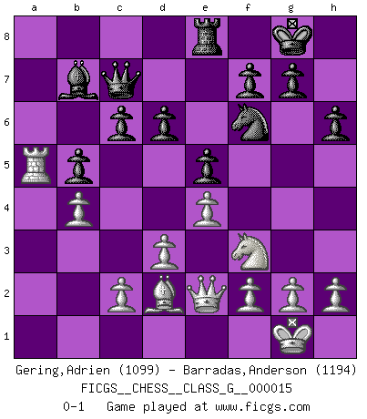 Last move : 0-1 2007 August 4 1:57:15 [Event "FICGS__CHESS__CLASS_G__000015"] [Site "FICGS"] [Date "2007.05.19"] [Round "1"] [White "Gering,Adrien"] [Black "Barradas,Anderson"] [Result "0-1"] [WhiteElo "1099"] [BlackElo "1194"] 1.e4 e5 2.Nf3 Nc6 3.Bc4 Nf6 4.Nc3 a6 5.d3 Bb4 6.Bd2 O-O 7.Qe2 Bxc3 8.bxc3 h6 9.O-O Re8 10.Rab1 b5 11.Bb3 Na5 12.c4 c6 13.cxb5 Nxb3 14.axb3 axb5 15.Ra1 Rxa1 16.Rxa1 Bb7 17.Ra7 Qb8 18.Ra5 Qc7 19.b4 d6 0-1 Two knights defense Kingside Castling by player Black (move 6) Kingside Castling by player White (move 9) Player Black won this chess game. Follow this game move after move (download)Good positions don't win games, good moves do. (Gerald Abrahams) Alle offensichtlichen Züge sehen nach dem Spiel in der Analyse verdächtig aus. (Viktor Kortschnoi) Los libros de Ajedrez deben de usarse igual como usamos los anteojos: para mejorar la vista, aunque algunos jugadores los quieren usar como si ellos les otorgaran la vision. (José Raúl Capablanca) Il vaut mieux sacrifier les pièces de l'adversaire. (Xavier Tartacover) I fear not the man who has practiced 10,000 kicks once, but I fear the man who has practiced one kick 10,000 times. (Bruce Lee)