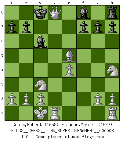 Last move : 1-0 2018 September 21 19:11:35 [Event "FICGS__CHESS__KING_SUPERTOURNAMENT__000003"] [Site "FICGS"] [Date "2018.09.16"] [Round "1"] [White "Csoma,Robert"] [Black "Jacon,Marcel"] [Result "1-0"] [WhiteElo "1655"] [BlackElo "1627"] 1.e4 e5 2.f4 exf4 3.Nf3 Qe7 4.Nc3 d5 5.d3 Qh4+ 6.Nxh4 dxe4 7.dxe4 Be6 8.Bxf4 Nc6 9.Bb5 Bd7 10.Bxc7 Nh6 11.Qd2 Ng4 12.O-O-O Nge5 13.Bxe5 O-O-O 14.Bxc6 Bxc6 15.Qxd8+ 1-0 King's knight's gambit Queenside Castling by player White (move 12) Queenside Castling by player Black (move 13) Player White won this chess game. Follow this game move after move (download)When asked, -How is that you pick better moves than your opponents?, I responded: I'm very glad you asked me that, because, as it happens, there is a very simple answer. I think up my own moves, and I make my opponent think up his. (Alexander Alekhine) Kasparov stellt für gewöhnlich die Regeln auf und bricht sie dann selbst wieder. (Alexej Shirov) La captura del Rey enemigo es la finalidad pero no el primer objetivo de la partida. (William Steinitz) Vous n'êtes pas toujours obligé de jouer le meilleur coup. Un coup doit être actif, entreprenant, correct et beau ! (David Bronstein) For to win one hundred victories in one hundred battles is not the acme of skill. To subdue the enemy without fighting is the acme of skill. (Sun Tzu)