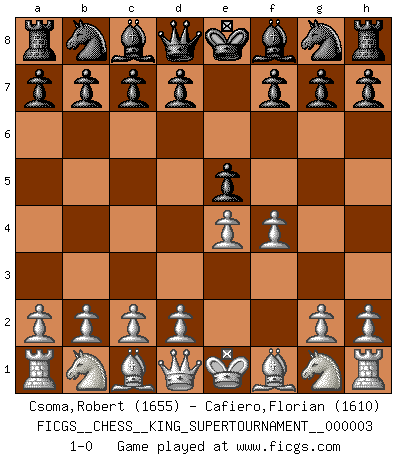 Last move : 1-0 2018 November 7 11:48:49 [Event "FICGS__CHESS__KING_SUPERTOURNAMENT__000003"] [Site "FICGS"] [Date "2018.09.16"] [Round "1"] [White "Csoma,Robert"] [Black "Cafiero,Florian"] [Result "1-0"] [WhiteElo "1655"] [BlackElo "1610"] 1.e4 e5 2.f4 1-0 King's gambit Player White won this chess game. Follow this game move after move (download)You know you're going to lose. Even when I was ahead I knew I was going to lose. - On playing against Fischer. (Andrew Soltis) Ja, ich habe einmal eine Blitzpartie gespielt, es war in einem Zug, 1929. --im Interview 1989 (Mikhail Moiseyevich Botvinik) Si el Ajedrez es una ciencia, es la mas inexacta. Si el Ajedrez es un arte, es demasiado inexacto para ser visto como tal. Si el Ajedrez es un deporte, es demasiado esotérico. Si el Ajedrez es un juego, es demasiado exigente para ser solo un juego. Si el Ajedrez es una aventura, es una muy demandante. Si el Ajedrez es una pasión, es una muy gratificante. Si el Ajedrez es la vida, es una muy triste. (Anónimo) Le moment que je préfère le plus dans une rencontre, c'est celui où je sens que la personnalité de l'adversaire se brise. (Robert Fischer) To steal ideas from one person is plagiarism. To steal from many is research. (Unknown)