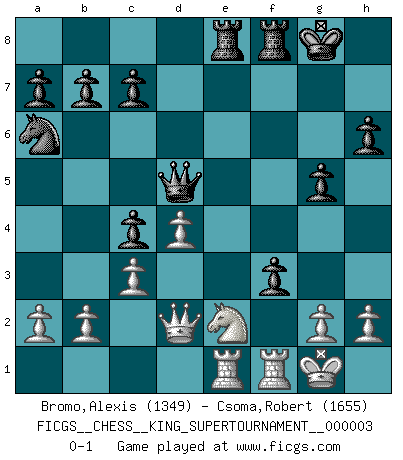 Last move : 0-1 2018 November 21 11:18:33 [Event "FICGS__CHESS__KING_SUPERTOURNAMENT__000003"] [Site "FICGS"] [Date "2018.09.16"] [Round "1"] [White "Bromo,Alexis"] [Black "Csoma,Robert"] [Result "0-1"] [WhiteElo "1349"] [BlackElo "1655"] 1.e4 e5 2.f4 exf4 3.Nf3 d6 4.d4 Nf6 5.Nc3 Be7 6.Bxf4 O-O 7.Bc4 Nxe4 8.Nxe4 d5 9.Nfg5 dxc4 10.c3 h6 11.Nf3 Bf5 12.Qe2 Qd5 13.Nfd2 Bxe4 14.Nxe4 Na6 15.O-O Rae8 16.Rae1 f5 17.Ng3 Bd6 18.Qd2 Bxf4 19.Qxf4 g5 20.Qd2 f4 21.Ne2 f3 0-1 This chess game has been lost on time (started : 2018.09.16 2:52:46) KGA : Fischer defense Kingside Castling by player Black (move 6) Kingside Castling by player White (move 15) Player Black won this chess game. Follow this game move after move (download)A Chess game is divided into three stages: the first, when you hope you have the advantage, the second when you believe you have an advantage, and the third... when you know you're going to lose ! (Savielly Tartakower) Ich verachte die Medien. (Robert James Fischer) Mis oponentes también hacen buenas movidas. A veces yo no tomo esas cosas en consideración. (Bobby Fischer) Toutes les manuvres exécutées sur une colonne ouverte ont pour but ultime l'intrusion définitive sur la septième ou la huitième rangée, en plein cur de la position ennemie. (Aaron Nimzovitch) War is the child of passion, passion is the child of narcissism and narcissism is the child. (...) Another game ? (Thibault de Vassal)