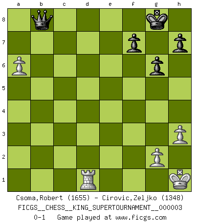 Last move : 0-1 2018 October 20 11:51:47 [Event "FICGS__CHESS__KING_SUPERTOURNAMENT__000003"] [Site "FICGS"] [Date "2018.09.16"] [Round "1"] [White "Csoma,Robert"] [Black "Cirovic,Zeljko"] [Result "0-1"] [WhiteElo "1655"] [BlackElo "1348"] 1.e4 e5 2.f4 exf4 3.Nf3 d5 4.exd5 Bd6 5.d4 Bg4 6.Bb5+ Nd7 7.O-O Ne7 8.c4 c6 9.dxc6 Nxc6 10.Re1+ Ne7 11.h3 Bxf3 12.Qxf3 O-O 13.Bxf4 Bb4 14.Re2 Nc6 15.Bxc6 bxc6 16.Qxc6 Nb6 17.d5 Rc8 18.Qb5 Rxc4 19.Bg3 a6 20.Qxa6 Qxd5 21.Nc3 Bxc3 22.bxc3 Qc6 23.Rc2 Rxc3 24.Rxc3 Qxc3 25.Rb1 Qxg3 26.Qxb6 Re8 27.Qb5 Rd8 28.a4 g6 29.a5 Rd2 30.Qb7 Qe3+ 31.Kh1 Qd3 32.Qb8+ Qd8 33.a6 Rd1+ 34.Rxd1 Qxb8 0-1 KGA : Abbazia defense (Classical defense, Modern defense!) Kingside Castling by player White (move 7) Kingside Castling by player Black (move 12) 10 pieces endgame at move 34 : White KRPPP , Black KQPPP WHITE : King + 1 Rook 3 Pawns BLACK : King + 1 Queen 3 Pawns Player Black won this chess game. Follow this game move after move (download)Botvinnik tried to take the mystery out of Chess, always relating it to situations in ordinary life. He used to call Chess a typical inexact problem similar to those which people are always having to solve in everyday life. (Garry Kasparov) Über Kasparov: Es ist offensichtlich, daß er in einem totalitären Staat aufwuchs und deshalb zu diktatorischen Zügen neigt. (Viktor Kortschnoi) La pasion por jugar al Ajedrez es una de las mas inexplicables en el mundo. (H.G. Wells) Assurément je connaissais par expérience le mystérieux attrait de ce jeu royal, le seul entre tous les jeux inventés par les hommes qui échappe souverainement à la tyrannie du hasard, le seul où l'on ne doive sa victoire qu'à son intelligence ou plutôt à une certaine forme d'intelligence. Mais n'est-ce pas déjà le limiter injurieusement que d'appeler les échecs un jeu ? N'est-ce pas une science, un art ou quelque chose qui, comme le cercueil de Mahomet entre ciel et terre, est suspendu entre l'un et l'autre, et qui réunit un nombre incroyable de contraires ? [...] C'est une pensée qui ne mène à rien, une mathématique qui n'établit rien, un art qui ne laisse pas d'uvre, une architecture sans matière; et il l'a prouvé néanmoins qu'il était plus durable, à sa manière, que les livres ou que tout autre monument, ce jeu unique qui appartient à tous les peuples et à tous les temps, et dont personne ne sait quel dieu en fit don à la terre pour tuer l'ennui, pour aiguiser l'esprit et stimuler l'âme. Où commence-t-il, où finit-il ? (Stefan Zweig) Good luck. You're gonna need it. (Han Solo in Star Wars ep.6)