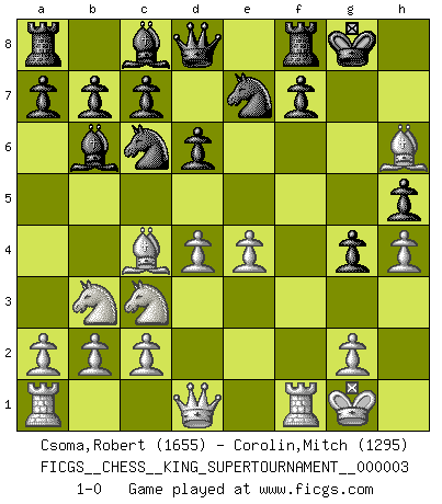 Last move : 1-0 2018 September 23 21:38:46 [Event "FICGS__CHESS__KING_SUPERTOURNAMENT__000003"] [Site "FICGS"] [Date "2018.09.16"] [Round "1"] [White "Csoma,Robert"] [Black "Corolin,Mitch"] [Result "1-0"] [WhiteElo "1655"] [BlackElo "1295"] 1.e4 e5 2.f4 exf4 3.Nf3 g5 4.h4 g4 5.Nd4 h5 6.Bc4 Bc5 7.Nb3 Bb6 8.d4 Nc6 9.Bxf4 d6 10.Nc3 Nge7 11.O-O O-O 12.Bh6 1-0 King's knight's gambit Kingside Castling by player White (move 11) Kingside Castling by player Black (move 11) Player White won this chess game. Follow this game move after move (download)Bobby Fischer is the greatest Chess player who has ever lived. (Ken Smith) Ich habe Putins Aufstieg an die Macht beobachtet und seine Politik, die demokratischen Institutionen meines Landes zu zerstören. (Garry Kasparov) De eso se trata el Ajedrez. Un día le das una lección a tu oponente y al día siguiente el te da una a tí. (Bobby Fischer) Les Echecs ont trois composantes : le temps, l'espace et le matériel en dernier. (Mikhail Tal) If you work for a living, why do you kill yourself working ? (Tuco to a chicken in The Good, The Bad and The Ugly)