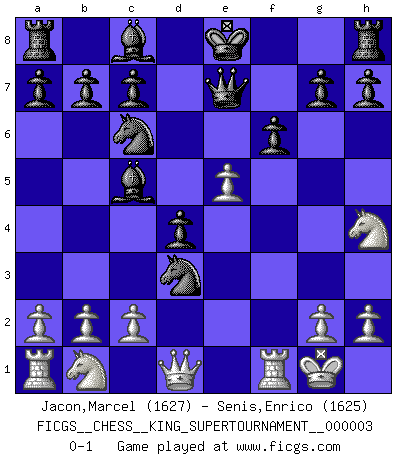 Last move : 0-1 2018 November 5 9:48:31 [Event "FICGS__CHESS__KING_SUPERTOURNAMENT__000003"] [Site "FICGS"] [Date "2018.09.16"] [Round "1"] [White "Jacon,Marcel"] [Black "Senis,Enrico"] [Result "0-1"] [WhiteElo "1627"] [BlackElo "1625"] 1.e4 e5 2.f4 d6 3.fxe5 dxe5 4.Nf3 Nc6 5.d4 exd4 6.Bb5 Bc5 7.Bd3 Nf6 8.e5 Qe7 9.O-O Nd5 10.Bg5 f6 11.Bf4 Nxf4 12.Nh4 Nxd3 0-1 This chess game has been lost on time (started : 2018.09.16 2:52:46) King's gambit Kingside Castling by player White (move 9) Player Black won this chess game. Follow this game move after move (download)Chess is a cold bath for the mind. (Sir John Simon) Kleine Schachspieler machen Mist, und große Schachspieler machen Mist, aber große machen weniger Mist. (Fritz Sämisch) No hay un Gran Maestro de Ajedrez que sea normal; solo se diferencían ellos por la magnitud de su locura. (Viktor Korchnoi) Même si l'adversaire joue le coup analysé précédemment, recommencez l'analyse en voyant la nouvelle position. Première règle de Blumenfeld The absolute truth is the thing that makes people laugh. (Carl Reiner)