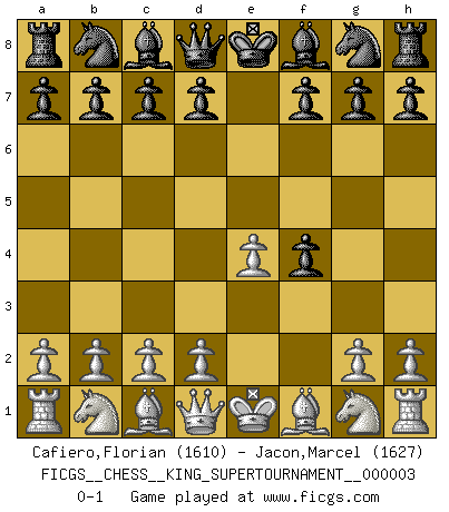 Last move : 0-1 2018 November 7 11:48:39 [Event "FICGS__CHESS__KING_SUPERTOURNAMENT__000003"] [Site "FICGS"] [Date "2018.09.16"] [Round "1"] [White "Cafiero,Florian"] [Black "Jacon,Marcel"] [Result "0-1"] [WhiteElo "1610"] [BlackElo "1627"] 1.e4 e5 2.f4 exf4 0-1 King's gambit accepted Player Black won this chess game. Follow this game move after move (download)If one piece is badly posted, the whole game is bad. (Tarrasch) Vielleicht wirkt die Aura früherer Spieler glanzvoller als die der heutigen Spieler, aber das liegt daran, dass man kein Programm wie Fritz hatte, das einem all die Löcher in ihren Partien zeigt. (Vladimir Kramnik) Debió haber existido una vez en que los hombres eran semidióses, de otra manera no hubiesen podido inventar el Ajedrez. (Gustav Schenk) Vouloir jouer aux échecs contre soi-même est aussi paradoxal que vouloir marcher sur son ombre. (Stefan Zweig) Watch your thoughts; they become words. Watch your words; they become actions. Watch your actions; they become habits. Watch your habits; they become character. Watch your character; it becomes your destiny. (Frank Outlaw)