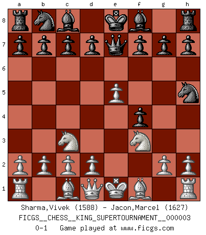 Last move : 0-1 2018 October 29 9:10:37 [Event "FICGS__CHESS__KING_SUPERTOURNAMENT__000003"] [Site "FICGS"] [Date "2018.09.16"] [Round "1"] [White "Sharma,Vivek"] [Black "Jacon,Marcel"] [Result "0-1"] [WhiteElo "1588"] [BlackElo "1627"] 1.e4 e5 2.f4 exf4 3.Nf3 Qe7 4.Nc3 Nf6 5.e5 Nh5 0-1 This chess game has been lost on time (started : 2018.09.16 2:52:46) King's knight's gambit Player Black won this chess game. Follow this game move after move (download)The sign of a great Master is his ability to win a won game quickly and painlessly. (Irving Chernev) Modernes Schach erfordert enorme Anspannung. Es ist für einen normalen Menschen unmöglich das auszuhalten. (Viktor Kortschnoi) Tu sabes, camarada Pachman, no disfruto el ser un Ministro, preferería jugar al Ajedrez como tu. (Che Guevara) En blitz, le Cavalier l'emporte sur le Fou. (Vlastimil Hort) For peace of mind, resign as general manager of the universe. (Douglas Adams)