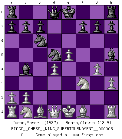 Last move : 0-1 2018 November 11 10:25:38 [Event "FICGS__CHESS__KING_SUPERTOURNAMENT__000003"] [Site "FICGS"] [Date "2018.09.16"] [Round "1"] [White "Jacon,Marcel"] [Black "Bromo,Alexis"] [Result "0-1"] [WhiteElo "1627"] [BlackElo "1349"] 1.e4 e5 2.f4 d6 3.fxe5 dxe5 4.Nf3 Nc6 5.d4 exd4 6.c3 Bg4 7.h3 Bh5 8.cxd4 Nf6 9.e5 Nd5 10.g4 Bb4+ 0-1 This chess game has been lost on time (started : 2018.09.16 2:52:46) King's gambit Player Black won this chess game. Follow this game move after move (download)Life is a kind of Chess, with struggle, competition, good and ill events. (Benjamin Franklin) Im Hotelzimmer gab es nur zwei Schaben. (Über die Turnierbedingungen) (Peter Swidler) Entre mas años cumplo, mas valoro los Peones. (Keres) Les Echecs ne sont pas pour les âmes timides. Ils requièrent un homme entier, qui ne s'arrête pas aveuglément à ce qui a été déjà établi, mais qui tente individuellement de sonder les profondeurs du jeu. (W. Steinitz) If you are good, you will be assigned all the work. If you are really good, you will get out of it. (Dan Rotaru)