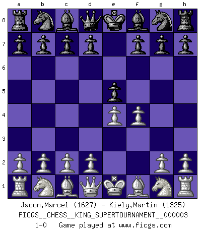 Last move : 1-0 2018 October 16 8:55:46 [Event "FICGS__CHESS__KING_SUPERTOURNAMENT__000003"] [Site "FICGS"] [Date "2018.09.16"] [Round "1"] [White "Jacon,Marcel"] [Black "Kiely,Martin"] [Result "1-0"] [WhiteElo "1627"] [BlackElo "1325"] 1.e4 e5 2.f4 1-0 This chess game has been lost on time (started : 2018.09.16 2:52:46) King's gambit Player White won this chess game. Follow this game move after move (download)Dazzling combinations are for the many, shifting wood is for the few. (Georg Kieninger) Auf Remis zu spielen ist gewissermaßen ein Verbrechen gegen das Schachspiel. (Mikhail Nekhemyevich Tal) El Ajedrez es tortura mental. (Garry Kasparov) Si le désir cupide (et stupide) de gagner est une inépuisable source de souffrance, une combinaison brillante sur l'échiquier est une découverte : le coquelicot qui s'épanouit lorsque apparaît la Voie Lactée. (Arrabal) Lottery : A tax on people who are bad at math. (Author unknown)