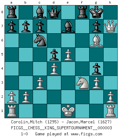 Last move : 1-0 2018 September 23 0:11:58 [Event "FICGS__CHESS__KING_SUPERTOURNAMENT__000003"] [Site "FICGS"] [Date "2018.09.16"] [Round "1"] [White "Corolin,Mitch"] [Black "Jacon,Marcel"] [Result "1-0"] [WhiteElo "1295"] [BlackElo "1627"] 1.e4 e5 2.f4 exf4 3.Nf3 Nf6 4.e5 Ng4 5.d4 Ne3 6.Bxe3 fxe3 7.Qd3 Bb4+ 8.c3 Be7 9.Qxe3 O-O 10.Bd3 Bh4+ 11.g3 Be7 12.Nbd2 d6 13.Ne4 d5 14.Neg5 Nc6 15.Bxh7+ Kh8 16.Qf4 f6 17.Qh4 fxg5 18.Qh5 g4 19.Bg6 Kg8 20.Qh7+ 1-0 KGA : Schallop defense Kingside Castling by player Black (move 9) Player White won this chess game. Follow this game move after move (download)By playing at Chess then, we may learn: First: Foresight... Second: Circumspection... Third: Caution... And lastly, we learn by Chess the habit of not being discouraged by present bad appearances in the state of our affairs, the habit of hoping for a favorable chance, and that of persevering in the secrets of resources. (Benjamin Franklin) Ein Großmeister muß tausende Partien in seinem Kopf speichern, denn diese sind für Ihn, was die Worte der Muttersprache für gewöhnliche Leute sind, oder Noten für Musiker... (Garry Kasparov) Aún el Rey más flojo huye despavorido ante la amenaza de un Jaque doble. (Aaron Nimzowitsch) Fischer est le meilleur joueur du monde et Karpov n'est qu'un joueur de bistrot. (Garry Kasparov, agé de 16 ans) There is a great deal of difference between an eager man who wants to read a book and a tired man who wants a book to read. (G.K. Chesterton)