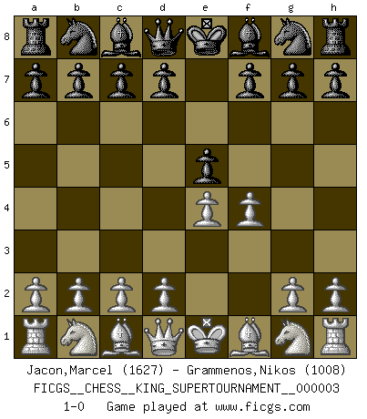 Last move : 1-0 2018 October 16 8:55:46 [Event "FICGS__CHESS__KING_SUPERTOURNAMENT__000003"] [Site "FICGS"] [Date "2018.09.16"] [Round "1"] [White "Jacon,Marcel"] [Black "Grammenos,Nikos"] [Result "1-0"] [WhiteElo "1627"] [BlackElo "1008"] 1.e4 e5 2.f4 1-0 This chess game has been lost on time (started : 2018.09.16 2:52:46) King's gambit Player White won this chess game. Follow this game move after move (download)Chess is a matter of delicate judgment, knowing when to punch and how to duck. (Bobby Fischer) Ich erzeugte keinen Neid, da mich die Schachspieler als Musiker und die Musiker als Schachspieler betrachteten. (Mark Taimanov) Yo siempre he tenido un ligero sentimiento de lástima por una persona que no tiene conocimiento del Ajedrez. (Siegbert Tarrasch) Avec des compensations pour le matériel en plus... (Anonyme) Control your own destiny or someone else will. (Jack Welch)