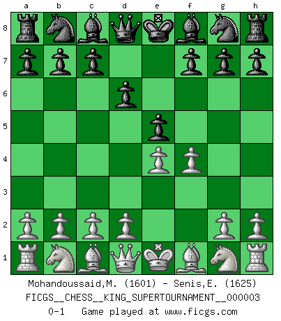 Last move : 0-1 2018 October 17 9:15:1 [Event "FICGS__CHESS__KING_SUPERTOURNAMENT__000003"] [Site "FICGS"] [Date "2018.09.16"] [Round "1"] [White "Mohandoussaid,Malik"] [Black "Senis,Enrico"] [Result "0-1"] [WhiteElo "1601"] [BlackElo "1625"] 1.e4 e5 2.f4 d6 0-1 This chess game has been lost on time (started : 2018.09.16 2:52:46) King's gambit Player Black won this chess game. Follow this game move after move (download)Everything is in a state of flux, and this includes the world of Chess. (Mikhail Botvinnik) Die jungen Leute sollen verstehen, dass sie noch etwas von mir lernen können und müssen. (Viktor Kortschnoi) Aún deseo matar a Fischer. (Boris Spassky) Les pièces de l'échiquier étaient impitoyables. Elles le retenaient, elles l'absorbaient. Il y avait de l'horreur en cela, mais aussi une harmonie unique. Car, qu'y a-t-il dans le monde, à part les échecs ? (V. Nabokov) O divine art of subtlety and secrecy! Through you we learn to be invisible, through you inaudible and hence we can hold the enemy's fate in our hands. (Sun Tzu)