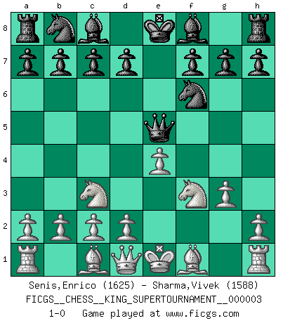 Last move : 1-0 2018 October 22 21:47:17 [Event "FICGS__CHESS__KING_SUPERTOURNAMENT__000003"] [Site "FICGS"] [Date "2018.09.16"] [Round "1"] [White "Senis,Enrico"] [Black "Sharma,Vivek"] [Result "1-0"] [WhiteElo "1625"] [BlackElo "1588"] 1.e4 e5 2.f4 Qh4+ 3.g3 Qf6 4.fxe5 Qxe5 5.Nc3 Nf6 6.Nf3 1-0 This chess game has been lost on time (started : 2018.09.16 2:52:46) King's gambit Player White won this chess game. Follow this game move after move (download)Chess is no whit inferior to the violin, and we have a large number of professional violinists. (Mikhail Botvinnik) Wie bekannt hörte Morphy 1859 auf, Schach zu spielen. Seine Enttäuschung galt nicht so sehr dem Schach, wie den Schachspielern. (Robert James Fischer) El Ajedrez es tan interesante por sí solo, que no es necesario un interés monetario para persuadir a una persona a que lo practique; por lo tanto, nunca se juega por dinero. (Benjamin Franklin) Mais n'est-ce pas déjà le limiter injurieusement que d'appeler les échecs un jeu? N'est-ce pas aussi une science, un art, ou quelque chose qui, comme le cercueil de Mahomet entre ciel et terre, est suspendu entre l'un et l'autre, et qui réunit un nombre incroyable de contraires ? (Stefan Zweig) Without deviation from the norm, progress is not possible. (Frank Zappa)