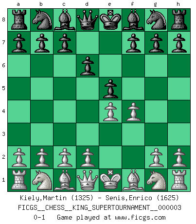 Last move : 0-1 2018 October 17 9:15:1 [Event "FICGS__CHESS__KING_SUPERTOURNAMENT__000003"] [Site "FICGS"] [Date "2018.09.16"] [Round "1"] [White "Kiely,Martin"] [Black "Senis,Enrico"] [Result "0-1"] [WhiteElo "1325"] [BlackElo "1625"] 1.e4 e5 2.f4 d6 0-1 This chess game has been lost on time (started : 2018.09.16 2:52:46) King's gambit Player Black won this chess game. Follow this game move after move (download)That's what Chess is all about. One day you give your opponent a lesson, the next day he gives you one. (Bobby Fischer) Schach ist ein schwarz-weisser Dschungel. (Garry Kasparov) Yo he agregado estos principios a la ley: pongan los Caballos en acción antes de que los dos Alfiles sean desarrollados. (Emanuel Lasker) RxDa4 pat (...) Yoga is 99% practice and 1% knowledge. (Sri Krishna Pattabhi Jois)