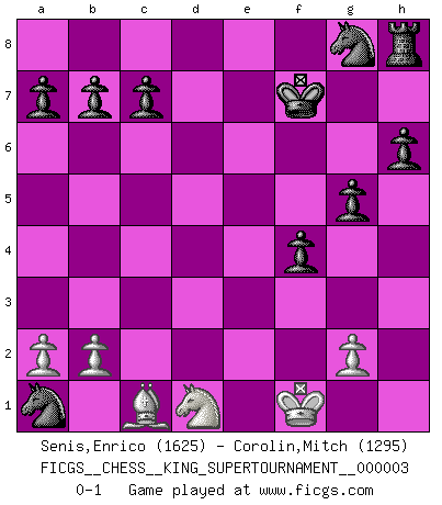 Last move : 0-1 2018 October 20 6:3:56 [Event "FICGS__CHESS__KING_SUPERTOURNAMENT__000003"] [Site "FICGS"] [Date "2018.09.16"] [Round "1"] [White "Senis,Enrico"] [Black "Corolin,Mitch"] [Result "0-1"] [WhiteElo "1625"] [BlackElo "1295"] 1.e4 e5 2.f4 exf4 3.Nf3 d6 4.Bc4 h6 5.h4 f6 6.d4 g5 7.hxg5 fxg5 8.Nc3 Bg7 9.e5 dxe5 10.Nxe5 Bxe5 11.dxe5 Qxd1+ 12.Nxd1 Nc6 13.e6 Nd4 14.Kd2 Bxe6 15.Bd3 Bf5 16.Bxf5 Nxf5 17.Re1+ Kf7 18.Nc3 Rd8+ 19.Ke2 Nd4+ 20.Kf1 Nxc2 21.Rd1 Rxd1+ 22.Nxd1 Nxa1 0-1 KGA : Fischer defense Player Black won this chess game. Follow this game move after move (download)The Chess pieces are the block alphabet which shapes thoughts; and these thoughts, although making a visual design on the chessboard, express their beauty abstractly, like a poem. (Marcel Duchamp) Ich moechte nie einem Club beitreten, der Leute wie mich als Mitglieder aufnimmt. (Woody Allen) Nada excita más a Grandes Maestros aburridos que una novedad teórica. (Dominic Lawson) Karpov est une pièce de musée. (Garry Kasparov) Fame, I have already. Now I need the money. (an elderly Steinitz)