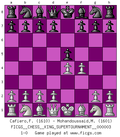 Last move : 1-0 2018 October 16 8:55:46 [Event "FICGS__CHESS__KING_SUPERTOURNAMENT__000003"] [Site "FICGS"] [Date "2018.09.16"] [Round "1"] [White "Cafiero,Florian"] [Black "Mohandoussaid,Malik"] [Result "1-0"] [WhiteElo "1610"] [BlackElo "1601"] 1.e4 e5 2.f4 1-0 This chess game has been lost on time (started : 2018.09.16 2:52:46) King's gambit Player White won this chess game. Follow this game move after move (download)Don't even mention losing to me. I can't stand to think of it. (Bobby Fischer) Smyslow ist ein Beweis dafür, dass ich noch zehn Jahre spielen kann! [der 75 jährige über den 85 jährigen] (Viktor Kortschnoi) En el tablero, la mentira e hipocresía no sobreviven mucho. (Emanuel Lasker) Donnez-moi un Cavalier en 6e et je gagnerais toutes mes parties. (Steinitz) A specialist learns more and more about less and less until he knows everything about nothing. (Nicholas Murray Butler)