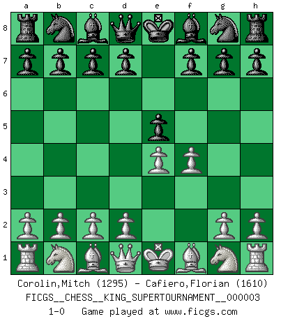 Last move : 1-0 2018 November 7 11:47:23 [Event "FICGS__CHESS__KING_SUPERTOURNAMENT__000003"] [Site "FICGS"] [Date "2018.09.16"] [Round "1"] [White "Corolin,Mitch"] [Black "Cafiero,Florian"] [Result "1-0"] [WhiteElo "1295"] [BlackElo "1610"] 1.e4 e5 2.f4 1-0 King's gambit Player White won this chess game. Follow this game move after move (download)A man without frontiers. He didn't divide the East and the West, he brought them together in their admiration for him. (Ljubomir Ljubojevic, about Bobby Fischer's death) Es tut gut, die Entwicklungsperiode von, [...] demokratischem Geist durchdringen zu lassen. Wie undemokratisch wäre es doch beispielsweise, den einen Offizier große Spaziertouren vornehmen zu lassen, während die anderen zu Hause säßen und sich entsetzlich langweilten. (Aaron Nimzowitsch) El Ajedrez es un expediente tonto que hace creer a la gente inactiva que hacen una cosa muy astuta cuando solamente estan perdiendo su tiempo. (George Bernard Shaw) Nous sommes les pions de la mystérieuse partie d'Echecs jouée par Dieu. Il nous déplace, nous arrête, nous pousse encore, puis nous lance un à un dans la boîte du Néant. Epitaphe sur la tombe de David Janowsky (1868-1927). Don't be irreplaceable, if you can't be replaced, you can't be promoted. (Dan Rotaru)