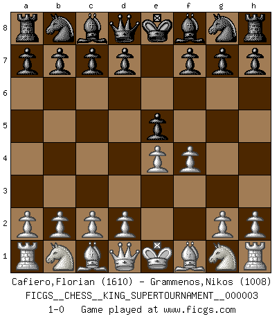 Last move : 1-0 2018 October 16 8:55:46 [Event "FICGS__CHESS__KING_SUPERTOURNAMENT__000003"] [Site "FICGS"] [Date "2018.09.16"] [Round "1"] [White "Cafiero,Florian"] [Black "Grammenos,Nikos"] [Result "1-0"] [WhiteElo "1610"] [BlackElo "1008"] 1.e4 e5 2.f4 1-0 This chess game has been lost on time (started : 2018.09.16 2:52:46) King's gambit Player White won this chess game. Follow this game move after move (download)There is no remorse like the remorse of Chess. (H. G. Wells) Das Blackmar-Diemer-Gambit verändert den ganzen Menschen! (Emil Joseph Diemer) La batalla por la última verdad nunca sera ganada. Y es por eso que el Ajedrez es tan fascinante. (Hans Kmoch) Toute estimation doit être constamment réévaluée. (Jacob Estrin) The best teachers teach from the heart, not from the book. (Author unknown)