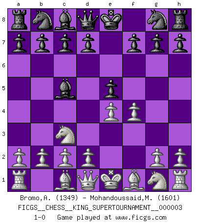 Last move : 1-0 2018 October 17 9:15:1 [Event "FICGS__CHESS__KING_SUPERTOURNAMENT__000003"] [Site "FICGS"] [Date "2018.09.16"] [Round "1"] [White "Bromo,Alexis"] [Black "Mohandoussaid,Malik"] [Result "1-0"] [WhiteElo "1349"] [BlackElo "1601"] 1.e4 e5 2.f4 Bc5 3.Nc3 1-0 This chess game has been lost on time (started : 2018.09.16 2:52:46) KGD : Classical variation Player White won this chess game. Follow this game move after move (download)The way he plays Chess demonstrates a man's whole nature. (Stanley Ellin) Offener Brief an US-Präsident Bush anlässlich der Verhaftung Bobby Fishers: Verhaften Sie mich. Stecken Sie mich in dieselbe Zelle wie Bobby Fisher und geben Sie uns ein Schachspiel mit. (Boris Vassilievich Spassky) ¿Esta Bobby Fischer algo cuerdo?. (Salo Flohr) Le succès, c'est être capable d'aller d'échec en échec sans perdre son enthousiasme. (Winston Churchill) Good decisions come from experience, and experience comes from bad decisions. (Anonymous)