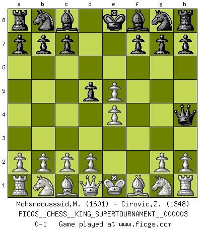 Last move : 0-1 2018 October 18 9:24:39 [Event "FICGS__CHESS__KING_SUPERTOURNAMENT__000003"] [Site "FICGS"] [Date "2018.09.16"] [Round "1"] [White "Mohandoussaid,Malik"] [Black "Cirovic,Zeljko"] [Result "0-1"] [WhiteElo "1601"] [BlackElo "1348"] 1.e4 e5 2.f4 d5 3.fxe5 Qh4+ 0-1 This chess game has been lost on time (started : 2018.09.16 2:52:46) KGD : Falkbeer counter-gambit Player Black won this chess game. Follow this game move after move (download)He who takes the Queen's Knight's Pawn will sleep in the streets. (Anonymous) Ich könnte leicht behaupten: Ja,ja, Leonid Breschnew wollte nicht, daß ich Weltmeister werde. In der Tat war die Sache komplizierter. (Viktor Kortschnoi) La enorme capacidad mental, en la que sin ella no puede un jugador de Ajedrez existir, es demasiado requerida por el Ajedrez al grado de que nunca podrá liberar su mente de este juego. (Albert Einstein) Si le désir cupide (et stupide) de gagner est une inépuisable source de souffrance, une combinaison brillante sur l'échiquier est une découverte : le coquelicot qui s'épanouit lorsque apparaît la Voie Lactée. (Arrabal) Employ the attack like tactic of defense. (Chinese proverb)