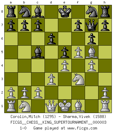 Last move : 1-0 2018 October 24 9:52:24 [Event "FICGS__CHESS__KING_SUPERTOURNAMENT__000003"] [Site "FICGS"] [Date "2018.09.16"] [Round "1"] [White "Corolin,Mitch"] [Black "Sharma,Vivek"] [Result "1-0"] [WhiteElo "1295"] [BlackElo "1588"] 1.e4 e5 2.f4 Qh4+ 3.g3 Qf6 4.d3 Bc5 5.Nf3 d6 6.f5 g6 7.Bg5 Qg7 8.g4 1-0 This chess game has been lost on time (started : 2018.09.16 2:52:46) King's gambit Player White won this chess game. Follow this game move after move (download)Chess is a terrible game. If you have no center, your opponent has a freer position. If you do have a center, then you really have something to worry about ! (Siegbert Tarrasch) Schach ist mein Leben, meine Leidenschaft, was ich gelernt habe und seit meinem 14. Lebensjahr profimässig praktiziere. Darauf zu verzichten, würde mir sehr schwer fallen. (Viktor Kortschnoi) El juego de Damas es para vagabundos. (Paul Morphy) Aux échecs, les retours au sommet sont rares : les dommages psychologiques consécutifs à une défaite sont trop sévères. (Daily Telegraph) The leaves of memory seemed to make a mournful rustling in the dark. (Henry Wadsworth Longfellow)