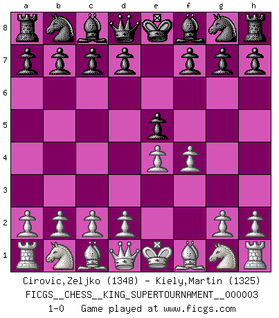 Last move : 1-0 2018 October 16 8:55:46 [Event "FICGS__CHESS__KING_SUPERTOURNAMENT__000003"] [Site "FICGS"] [Date "2018.09.16"] [Round "1"] [White "Cirovic,Zeljko"] [Black "Kiely,Martin"] [Result "1-0"] [WhiteElo "1348"] [BlackElo "1325"] 1.e4 e5 2.f4 1-0 This chess game has been lost on time (started : 2018.09.16 2:52:46) King's gambit Player White won this chess game. Follow this game move after move (download)It is the aim of the modern school, not to treat every position according to one general law, but according to the principle inherent in the position. (Richard Reti) Im Leben werden Partien nie so unstrittig gewonnen wie im Spiel (Emanuel Lasker) De todos mis libros Rusos, la defensa contiene y difunde el 'calor' mas grande que pudiese verse extraño al observar lo supremamente abstracto que el Ajedrez supuestamente es. (Vladimir Nabokov) Psychologiquement, tu dois avoir confiance en toi même, mais cette confiance doit être basée sur des faits. (Robert Fischer) The intuitive mind is a sacred gift; the rational mind is a faithful servant. We have created a society that honors the servant but has forgotten the gift. (Albert Einstein)