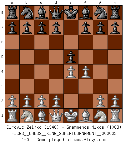 Last move : 1-0 2018 October 16 8:55:46 [Event "FICGS__CHESS__KING_SUPERTOURNAMENT__000003"] [Site "FICGS"] [Date "2018.09.16"] [Round "1"] [White "Cirovic,Zeljko"] [Black "Grammenos,Nikos"] [Result "1-0"] [WhiteElo "1348"] [BlackElo "1008"] 1.e4 e5 2.f4 1-0 This chess game has been lost on time (started : 2018.09.16 2:52:46) King's gambit Player White won this chess game. Follow this game move after move (download)Fischer is the strongest player in the world. In fact, the strongest player who ever lived. (Larry Evans) Im Schach nämlich geht es darum, daß Ich des Gegners klein zu kriegen, sein Ego zu zerbrechen und zu zermahlen, seine Selbstachtung zu zertreten und zu verscharren und seine ganze mißachtenswerte sogenannte Persönlichkeit ein für alle Mal tot zu hacken und zu zerstampfen und dadurch die menschliche Gesellschaft von einer stinkenden Pestbeule zu befreien. Es ist ein königliches Spiel. (Robert James Fischer) El Ajedrez es tan interesante por sí solo, que no es necesario un interés monetario para persuadir a una persona a que lo practique; por lo tanto, nunca se juega por dinero. (Benjamin Franklin) La vérité est comme le meilleur coup aux échecs : elle existe, mais il faut la chercher. (Arturo Perez-Reverte) All war is based on deception. (Sun Tzu)