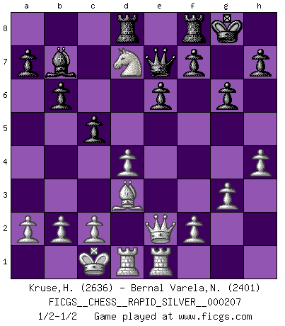 Last move : 1/2-1/2 2018 October 17 10:38:16 [Event "FICGS__CHESS__RAPID_SILVER__000207"] [Site "FICGS"] [Date "2018.09.18"] [Round "1"] [White "Kruse,Herbert"] [Black "Bernal Varela,Nelson"] [Result "1/2-1/2"] [WhiteElo "2636"] [BlackElo "2401"] 1.e4 e6 2.d4 d5 3.Nc3 Nf6 4.Bg5 dxe4 5.Nxe4 Be7 6.Bxf6 Bxf6 7.Nf3 Nd7 8.Qd2 O-O 9.O-O-O b6 10.Nxf6+ Nxf6 11.Ne5 Bb7 12.Bd3 Qe7 13.Rhe1 Rad8 14.g3 Nd7 15.Qe2 g6 16.h4 c5 17.Nxd7 1/2-1/2 French : Burn variation Kingside Castling by player Black (move 8) Queenside Castling by player White (move 9) This chess game ended in a draw. Follow this game move after move (download)After a bad opening, there is hope for the middle game. After a bad middle game, there is hope for the endgame. But once you are in the endgame, the moment of truth has arrived. (Edmar Mednis) Schach wird sich dank seiner hohen kulturellen Tradition immer durchsetzen. In näherer Zukunft womöglich sogar als Gegenreaktion auf die maßlose Reizüberflutung im Freizeit- und Spielbereich. (Garry Kasparov) Solo puedes ser bueno en el Ajedrez si amas al juego. (Bobby Fischer) On peut tirer plus d'utilité d'une partie perdue que de 100 parties gagnées. (Capablanca) Creativity is inventing, experimenting, growing, taking risks, breaking rules, making mistakes, and having fun. (Mary Lou Cook)