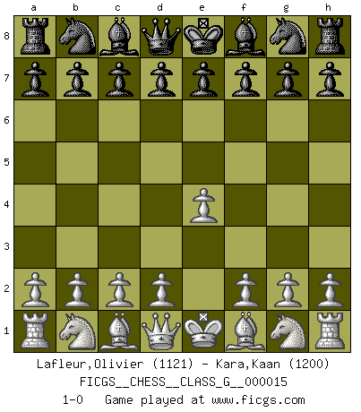 Last move : 1-0 2007 June 28 15:10:16 [Event "FICGS__CHESS__CLASS_G__000015"] [Site "FICGS"] [Date "2007.05.19"] [Round "1"] [White "Lafleur,Olivier"] [Black "Kara,Kaan"] [Result "1-0"] [WhiteElo "1121"] [BlackElo "1200"] 1.e4 1-0 This chess game has been lost on time (started : 2007.05.19 4:57:19) King's pawn Opening Player White won this chess game. Follow this game move after move (download)My God, Bobby Fischer plays so simply. (Alexei Suetin) Es ist peinlich, dass ich nie Weltmeister wurde. Es wäre leicht, Leonid Breschnjew als Ursache vorzuschieben, dessen Apparat den Vorzeigekommunisten Anatoli Karpow in allem unterstützte. Aber Garri Kasparow zum Beispiel, der ebenfalls von den Sowjets unerwünscht war, hat trotz der Widerstände den WM-Titel erobert. (Viktor Kortschnoi) No todos los artistas son jugadores de Ajedrez, pero todos los jugadores de Ajedrez son artistas. (Marcel Duchamp) La tactique est l'élément le plus important du milieu de jeu. (Siegbert Tarrasch) Ah, beer! The cause of, and the solution to, all of life's problems. (Homer Simpson)