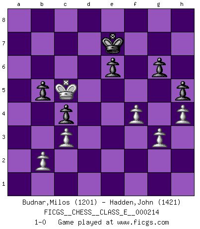 Last move : 1-0 2018 October 27 19:48:49 [Event "FICGS__CHESS__CLASS_E__000214"] [Site "FICGS"] [Date "2018.09.20"] [Round "1"] [White "Budnar,Milos"] [Black "Hadden,John"] [Result "1-0"] [WhiteElo "1201"] [BlackElo "1421"] 1.e4 e5 2.Nf3 Nc6 3.Bb5 Nge7 4.O-O d6 5.d3 h6 6.h3 a6 7.Ba4 b5 8.Bb3 Be6 9.d4 exd4 10.Nxd4 Nxd4 11.Qxd4 Bxb3 12.axb3 c5 13.Qe3 Nc6 14.c3 Ne5 15.f4 Nc6 16.Nd2 Be7 17.Nf3 O-O 18.e5 Qb6 19.b4 Rab8 20.bxc5 Qxc5 21.Qxc5 dxc5 22.Rxa6 Nd8 23.Be3 Ne6 24.Rd1 c4 25.Rd7 Bc5 26.Bd4 Rfd8 27.Rxd8 Rxd8 28.Bxc5 Nxc5 29.Rd6 Rxd6 30.exd6 Kf8 31.Nd4 Ne6 32.d7 Ke7 33.Nxe6 fxe6 34.Kf2 Kxd7 35.Ke3 Kd6 36.Kd4 g6 37.h4 h5 38.g3 Ke7 39.Kc5 1-0 Ruy Lopez : Cozio defense Kingside Castling by player White (move 4) Kingside Castling by player Black (move 17) Player White won this chess game. Follow this game move after move (download)Chess is a matter of delicate judgment, knowing when to punch and how to duck. (Bobby Fischer) Ich habe die besten Aussichten, den ersten Preis zu gewinnen - denn jeder muss gegen Steinitz spielen, nur ich nicht! (Wilhelm Steinitz) El estómago es una parte esencial del maestro de Ajedrez. (Bent Larsen) J'apprécie les joueurs d'est-indienne, c'est grâce à eux que je nourris ma famille depuis tant d'années. (Petrosian) No man has ever achieved immortality in his own life time. (Unknown)