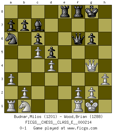 Last move : 0-1 2019 January 7 9:26:15 [Event "FICGS__CHESS__CLASS_E__000214"] [Site "FICGS"] [Date "2018.09.20"] [Round "1"] [White "Budnar,Milos"] [Black "Wood,Brian"] [Result "0-1"] [WhiteElo "1201"] [BlackElo "1288"] 1.e4 e5 2.Nf3 Nf6 3.Nxe5 d6 4.Nf3 Nxe4 5.d4 d5 6.Bd3 Bd6 7.O-O O-O 8.c4 c6 9.c5 Bc7 10.h3 Bf5 11.Bg5 Nxg5 12.Bxf5 Nxf3+ 13.Qxf3 Qf6 14.Qg4 h5 15.Qxh5 g6 16.Bxg6 fxg6 17.Qg4 Na6 18.a3 Rae8 0-1 Petrov : Classical attack, Marshall variation Kingside Castling by player White (move 7) Kingside Castling by player Black (move 7) Player Black won this chess game. Follow this game move after move (download)Everything is in a state of flux, and this includes the world of Chess. (Mikhail Botvinnik) Ich spiele 70 Eröffnungssysteme. (Viktor Kortschnoi) Fischer no está bajo la obligación de nadie. (Joseph Platz) Tout change constamment, y compris dans le monde des Echecs. (Botvinnik) Excelling at chess has long been considered a symbol of more general intelligence. That is an incorrect assumption in my view, as pleasant as it might be. But for the purposes of argument and investigation, chess is, in Russkin-Gutman's words, 'an unparalleled laboratory, since both the learning process and the degree of ability obtained can be objectified and quantified, providing an excellent comparative framework on which to use rigorous analytical techniques.' (The Chess Master and the Computer, by Garry Kasparov - 2010)