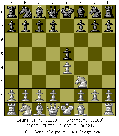 Last move : 1-0 2018 October 30 21:25:25 [Event "FICGS__CHESS__CLASS_E__000214"] [Site "FICGS"] [Date "2018.09.20"] [Round "1"] [White "Leurette,Marc-Antoine"] [Black "Sharma,Vivek"] [Result "1-0"] [WhiteElo "1338"] [BlackElo "1588"] 1.e4 e5 2.Nf3 1-0 This chess game has been lost on time (started : 2018.09.20 18:36:0) King's knight Opening Player White won this chess game. Follow this game move after move (download)Chess is thirty to forty percent psychology. You don't have this when you play a computer. I can't confuse it. (Judith Polgar) Das Schachspiel ist ein See, in welchem eine Mücke baden und ein Elefant ertrinken kann. (Emanuel Lasker) No hay otro maestro que tenga una voluntad terrífica de ganar. Al tablero, el irradía peligro y aún los oponentes mas fuertes tienden a congelarse como liebres cuando olfatean a una pantera. Aún sus debilidades son peligrosas. Con las blancas, su juego de apertura es predecible - te es posible hacer planes en su contra - pero es tan fuerte que tus planes casi nunca funcionan. En el juego medio, su precisión e invención son fabulosas y en finales, tú simplemente no le puedes vencer. (Experto Alemán anónimo) Le pion, dans sa simplicité, marche droit devant lui, mais lorsqu'il prend, il le fait obliquement? Ainsi l'homme, tant qu'il reste pauvre, marche dans la droiture et vit honnêtement, mais lorsqu'il recherche les honneurs, il flatte, se parjure et, par les voies obliques, cherche une position supérieure sur l'échiquier du monde. (Jean de Galles) I teach you to lie, cheat and steal, and as soon as my back's turned you wait in line ? (Gregory House, House M.D.)