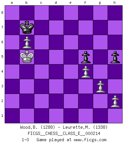 Last move : 1-0 2018 December 9 7:56:28 [Event "FICGS__CHESS__CLASS_E__000214"] [Site "FICGS"] [Date "2018.09.20"] [Round "1"] [White "Wood,Brian"] [Black "Leurette,Marc-Antoine"] [Result "1-0"] [WhiteElo "1288"] [BlackElo "1338"] 1.Nf3 d5 2.c4 e6 3.d4 Nf6 4.g3 Bb4+ 5.Bd2 Bxd2+ 6.Nbxd2 O-O 7.Bg2 Nc6 8.cxd5 exd5 9.O-O Be6 10.e3 Qd7 11.Ne5 Nxe5 12.dxe5 Ne4 13.Nxe4 dxe4 14.Qxd7 Bxd7 15.Bxe4 c6 16.Rfd1 Bh3 17.f4 g6 18.Bf3 f5 19.Rd7 Rab8 20.Rad1 Rf7 21.e6 Rxd7 22.Rxd7 Re8 23.e7 Kf7 24.Rxb7 Rxe7 25.Bxc6 Bg4 26.Rxe7+ Kxe7 27.Kf2 Kd6 28.Bf3 Bh3 29.b4 h6 30.a4 Kc7 31.e4 fxe4 32.Bxe4 Bf5 33.Bxf5 gxf5 34.Ke3 Kd6 35.Kd4 h5 36.b5 Ke6 37.Kc5 Kd7 38.a5 Kc7 39.b6+ axb6+ 40.axb6+ Kb7 41.Kb5 1-0 Reti Opening Kingside Castling by player Black (move 6) Kingside Castling by player White (move 9) 10 pieces endgame at move 33 : White KPPPPP , Black KPPP WHITE : King + 5 Pawns BLACK : King + 3 Pawns 9 pieces endgame at move 39 : White KPPPP , Black KPPP WHITE : King + 4 Pawns BLACK : King + 3 Pawns 8 pieces endgame at move 40 : White KPPPP , Black KPP WHITE : King + 4 Pawns BLACK : King + 2 Pawns Player White won this chess game. Follow this game move after move (download)Alekhine is a poet who creates a work of art out of something that would hardly inspire another man to send home a picture post card. (Max Euwe) Ich verachte Kasparow. (Viktor Kortschnoi) Con o sin el título, Bobby Fischer fue sin lugar a dudas el mas grande jugador de su época. (Burt Hochberg) Ce qui caractérise les parties de combat, c'est que si le défenseur a constamment de difficiles problèmes à résoudre, l'attaquant doit chercher sans relâche de nouvelles possibilités d'attaque. (Koblentz) It's not enough to succeed. Others must fail. (Gore Vidal)