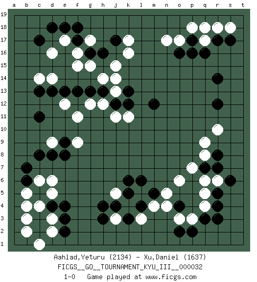 Last move : 1-0 2019 February 5 12:53:7 [Event "FICGS__GO__TOURNAMENT_KYU_III__000032 "] [Site "FICGS"] [Date "2018.09.22"] [Round "1"] [Black "Aahlad,Yeturu "] [White "Xu,Daniel "] [Result "1-0"] [Rating 1 "2134"] [Rating 2 "1637"] 1.q16 c4 2.q3 d16 3.e3 d6 4.h3 d3 5.e4 q5 6.c5 d5 7.d4 b4 8.c3 b3 9.c2 b2 10.r5 r6 11.r4 q6 12.o4 r10 13.f17 c14 14.d18 f15 15.h16 h14 16.c8 c6 17.c11 k17 18.j17 k16 19.r14 j15 20.c17 q17 21.p17 p18 22.r17 q18 23.p16 r18 24.s17 o17 25.o16 n17 26.r8 q8 27.q7 q9 28.r7 p7 29.s6 o6 30.m5 j3 31.j4 k4 32.k5 j5 33.h4 l5 34.k6 m4 35.l6 n5 36.l4 l3 37.k3 n4 38.b7 d2 39.b6 b5 40.e2 c1 41.d13 d14 42.c13 s18 43.r12 p3 44.p2 q4 45.r3 o3 46.f13 g17 47.g16 e17 48.e18 f16 49.f18 g15 50.o2 d9 51.d8 f9 52.e8 f11 53.e9 e12 54.e13 g12 55.g13 h12 56.h13 j13 57.j12 j11 58.k12 k11 59.k13 j14 60.m12 1-0 Here are the names of the openings (joseki) played in the four corners : Corner d4 : c4 e3Komoku (Somok, Xiao~mu`) 3-4 Point. The komoku (3-4) point is the traditional corner enclosure move..Ikken Kakari (Hankan Keolch'im, Yi Gua`jiao~, 1-Space Low Pincer). The small knight move is the basic approach move to the 3-4 point stone. It has been continually used for over four centuries. There are limitless variations, with new moves constantly being discovered. Black 2 opens the door to a treaure store of joseki. Corner q4 : q3 q5Komoku (Somok, Xiao~mu`) 3-4 Point. The komoku (3-4) point is the traditional corner enclosure move..Ikken Takagakari (Hankan Nop'dakeolch'im, Yi Gaogua`jiao~, 1-Space High Approach). The 5-4 approach move has become more popular in modern times, as modern Go emphasizes speed and influence. Corner d16 : d16 f17Hoshi (Hwajeom, Seongjeom, Xingwei`) 4-4 Point. The star or hoshi (4-4) point, emphasizing influence at the potential expense of territory.Ikken Kakari (Hankan Keolch'im, Yi Gua`jiao~, 1-Space Low Approach). Black 2 is the standard approach move to the 4-4. Player Black won this Go (weiqi, baduk) game.Follow this game move after move (download ) With less than 15 stones in danger, tenuki. (Anonymous) He who is a good ruler must first have been ruled. (Aristotle)