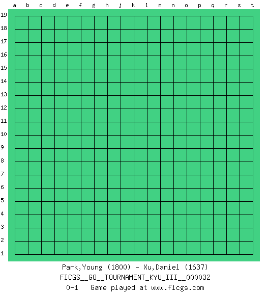 Last move : 0-1 2018 October 22 21:47:17 [Event "FICGS__GO__TOURNAMENT_KYU_III__000032"] [Site "FICGS"] [Date "2018.09.22"] [Round "1"] [Black "Park,Young"] [White "Xu,Daniel"] [Result "0-1"] [Rating 1 "1800"] [Rating 2 "1637"] 0-1 This go game has been lost on time (started : 2018.09.22 16:20:9) Here are the names of the openings (joseki) played in the four corners : Player White won this Go (weiqi, baduk) game. Follow this game move after move (download)Knight's moves win running battles. (Anonymous) Secret operations are essential in war; upon them the army relies to make its every move. (Sun Tzu)