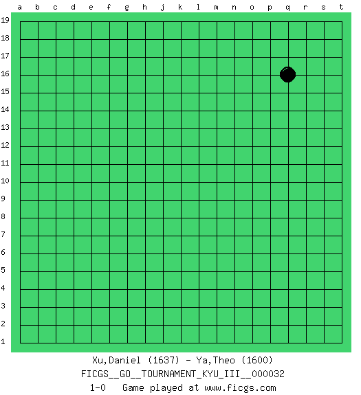 Last move : 1-0 2018 November 11 22:28:31 [Event "FICGS__GO__TOURNAMENT_KYU_III__000032"] [Site "FICGS"] [Date "2018.09.22"] [Round "1"] [Black "Xu,Daniel"] [White "Ya,Theo"] [Result "1-0"] [Rating 1 "1637"] [Rating 2 "1600"] 1.q16 1-0 This go game has been lost on time (started : 2018.09.22 16:20:9) Here are the names of the openings (joseki) played in the four corners : Player Black won this Go (weiqi, baduk) game. Follow this game move after move (download)Studying go is a wonderful way to develop both the creative as well as the logical abilities of children because to play it both sides of the brain are necessary. (Cho Chikun) In God we trust, all others we virus scan. (Anonymous)