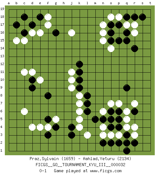 Last move : 0-1 2019 January 26 11:31:4 [Event "FICGS__GO__TOURNAMENT_KYU_III__000032"] [Site "FICGS"] [Date "2018.09.22"] [Round "1"] [Black "Praz,Sylvain"] [White "Aahlad,Yeturu"] [Result "0-1"] [Rating 1 "1659"] [Rating 2 "2134"] 1.q16 d4 2.q3 d16 3.f3 c6 4.q9 f17 5.j4 q5 6.o4 r3 7.r2 r4 8.r6 p3 9.p2 q2 10.q1 o3 11.p4 q4 12.o2 n3 13.q2 n4 14.p6 q6 15.o6 r7 16.m5 p7 17.n5 o7 18.r14 o5 19.p5 n6 20.o5 p18 21.q18 q17 22.p17 r17 23.r18 p16 24.o17 r16 25.q15 o18 26.s18 n17 27.o16 n16 28.o15 n15 29.g16 o14 30.p15 j16 31.c16 c15 32.d17 e16 33.b17 b15 34.e18 f18 35.c18 d11 36.d10 e10 37.d9 c11 38.f8 k5 39.l6 k6 40.l7 k7 41.l8 k4 42.j3 k8 43.k9 j9 44.k10 j10 45.k11 j11 46.k12 l3 47.n2 f4 48.g4 g5 49.f5 e4 0-1 Here are the names of the openings (joseki) played in the four corners : Corner d4 : d4 f3 Hoshi (Hwajeom, Seongjeom, Xingwei`) 4-4 Point. The star or hoshi (4-4) point, emphasizing influence at the potential expense of territory. Ikken Kakari (Hankan Keolch'im, Yi Gua`jiao~, 1-Space Low Approach). Black 2 is the standard approach move to the 4-4. Player White won this Go (weiqi, baduk) game. Follow this game move after move (download)Nothing requires doing this or that, but necessity exists. (Pierre Audouard) Memory is a crazy woman that hoards colored rags and throws away food. (Austin O'Malley)