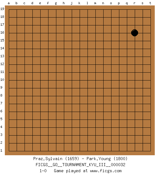 Last move : 1-0 2018 October 22 21:47:17 [Event "FICGS__GO__TOURNAMENT_KYU_III__000032"] [Site "FICGS"] [Date "2018.09.22"] [Round "1"] [Black "Praz,Sylvain"] [White "Park,Young"] [Result "1-0"] [Rating 1 "1659"] [Rating 2 "1800"] 1.r16 1-0 This go game has been lost on time (started : 2018.09.22 16:20:9) Here are the names of the openings (joseki) played in the four corners : Player Black won this Go (weiqi, baduk) game. Follow this game move after move (download)Do not fear furikawari. (Anonymous) It is the aim of the modern school, not to treat every position according to one general law, but according to the principle inherent in the position. (Richard Reti)