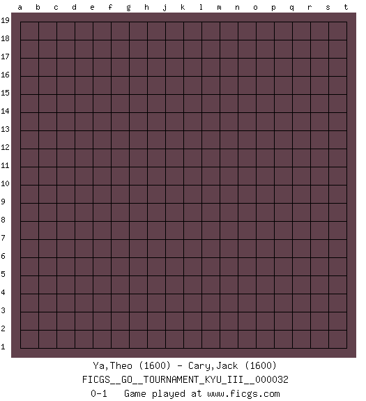 Last move : 0-1 2018 October 22 21:47:17 [Event "FICGS__GO__TOURNAMENT_KYU_III__000032"] [Site "FICGS"] [Date "2018.09.22"] [Round "1"] [Black "Ya,Theo"] [White "Cary,Jack"] [Result "0-1"] [Rating 1 "1600"] [Rating 2 "1600"] 0-1 This go game has been lost on time (started : 2018.09.22 16:20:9) Here are the names of the openings (joseki) played in the four corners : Player White won this Go (weiqi, baduk) game. Follow this game move after move (download)In an unreasonable situation, an unreasonable move is reasonable. (Tamino) Success without honor is an unseasoned dish; it will satisfy your hunger, but it won't taste good. (Joe Paterno)